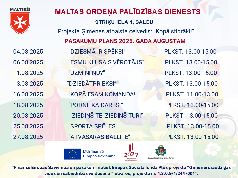 Maltiešu darbsProjektiSALDUS. PASĀKUMU PLĀNS 2025. GADA AUGUSTAM maltiesi.lv01 min Ziņu izvēlne Previous: Saldus. Projekts “Kopā stiprāki”. Fotoatskaite Jūlijs 2025Next: Projekts “Kopā Latvijai”. Kultūrorientācijas kursi un iekļaušanās pasākumi Ukrainas civiliedzīvotājiem. Fotoatskaite